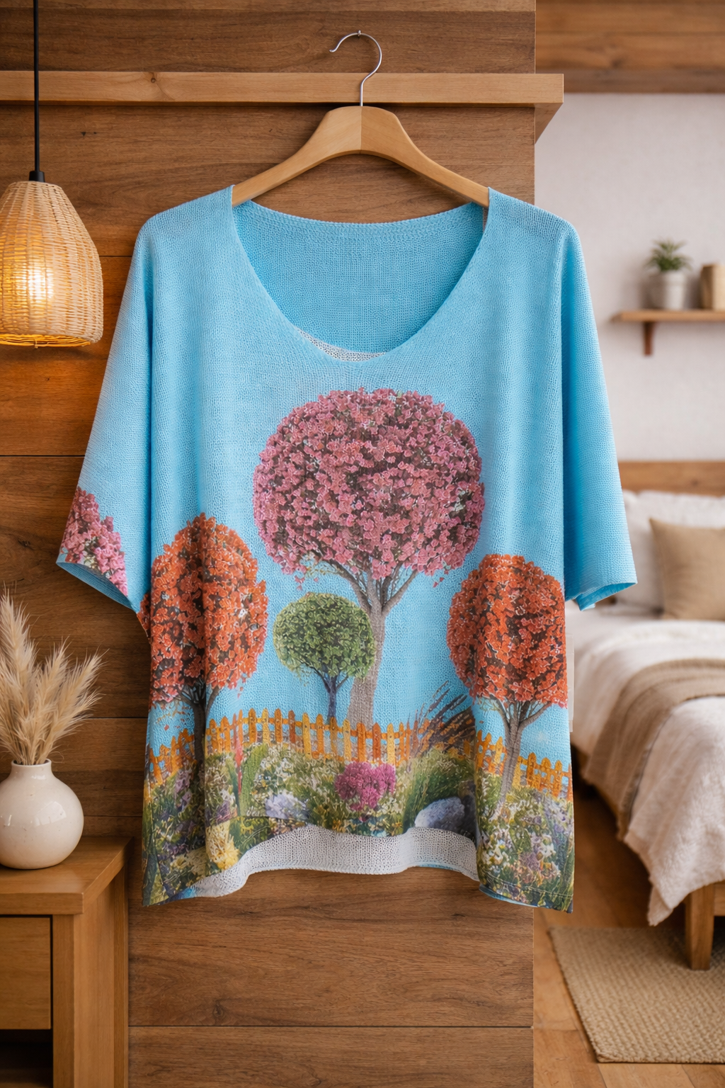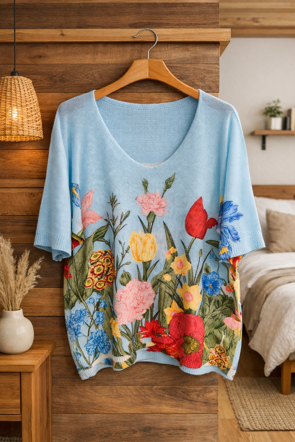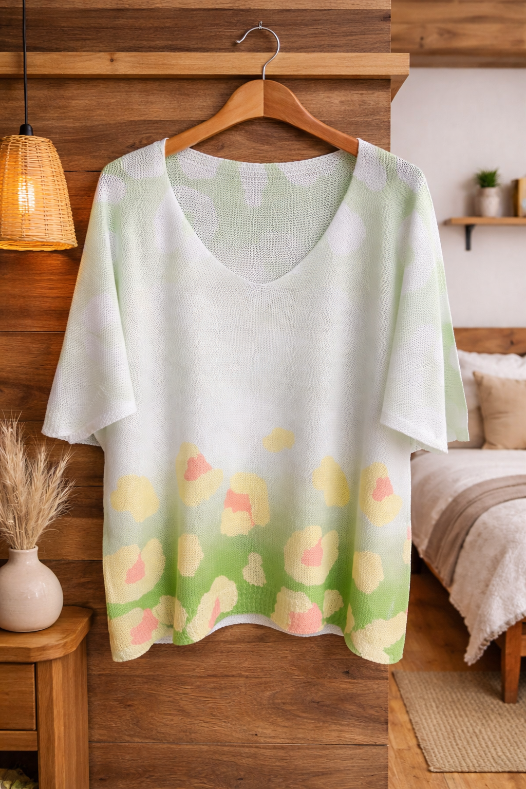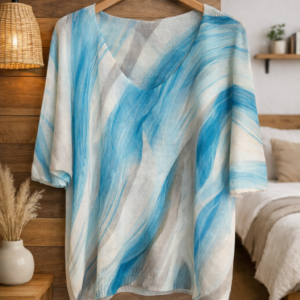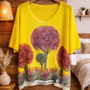 Blusa ligera de cuello en V con un hermoso diseño artístico inspirado en la naturaleza. Su estampado floral y colores vibrantes aportan un toque elegante y moderno, perfecta para un look casual cómodo y femenino en cualquier ocasión. 🌸