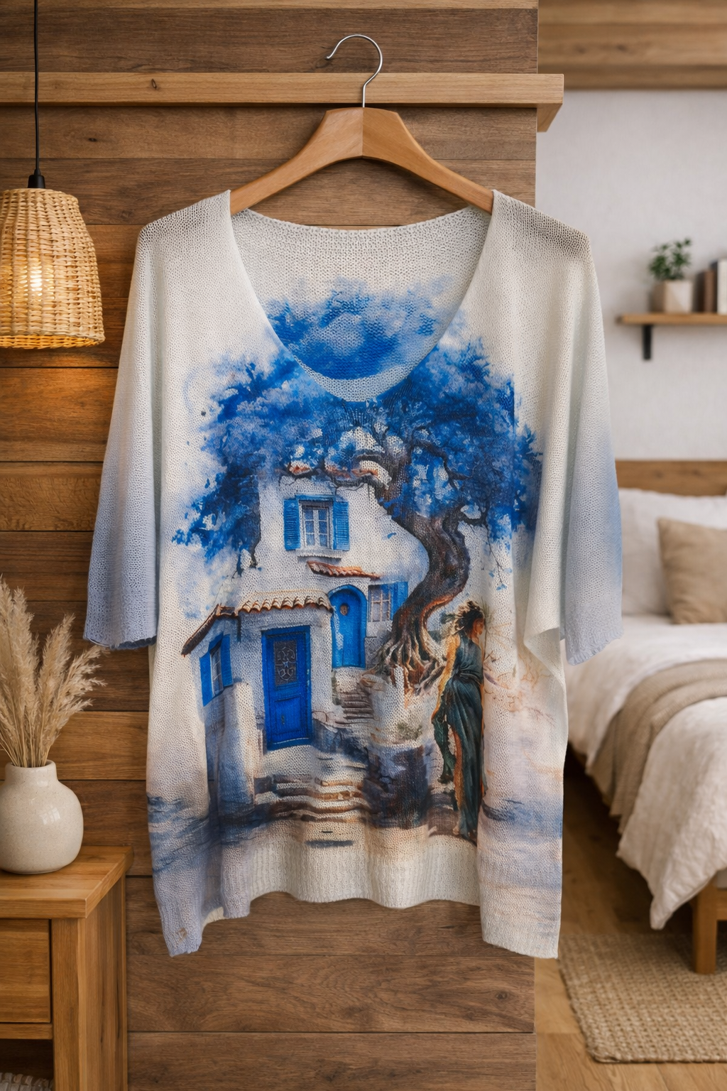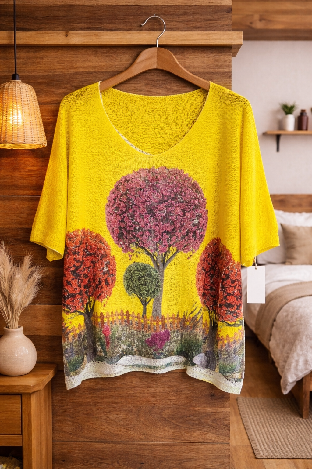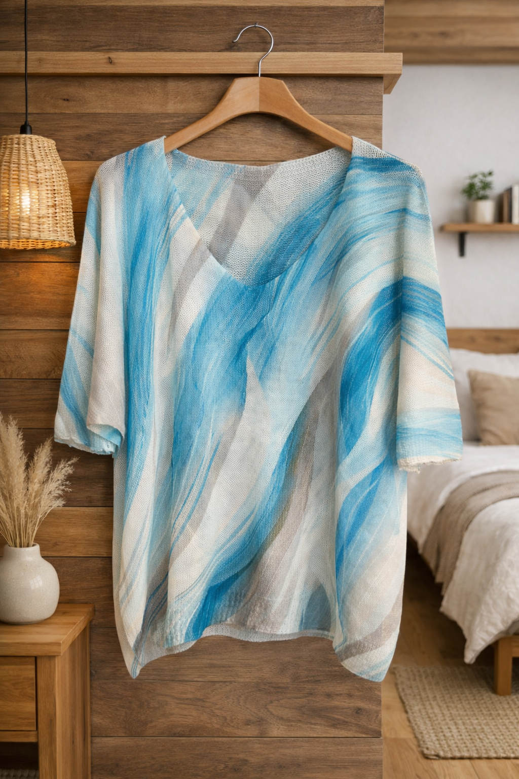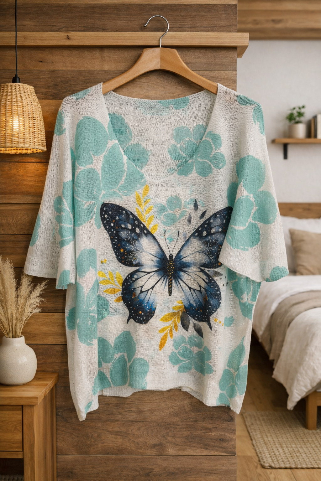 Blusa ligera de cuello en V con un hermoso diseño artístico inspirado en la naturaleza. Su estampado floral y colores vibrantes aportan un toque elegante y moderno, perfecta para un look casual cómodo y femenino en cualquier ocasión. 🌸
