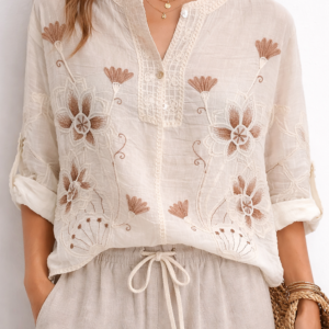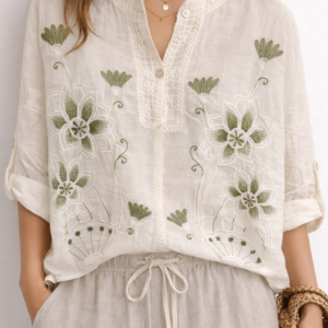 Blusa ligera de estilo boho confeccionada en tejido suave y transpirable, ideal para los días cálidos. Presenta delicados bordados florales que aportan un toque artesanal y elegante. Su diseño de manga corta enrollable y cuello redondo con botones crea un look relajado y femenino. Perfecta para combinar con pantalones de lino, jeans o faldas para un estilo casual chic en primavera y verano. Disponible en varios colores de bordado para adaptarse a tu estilo. ✨