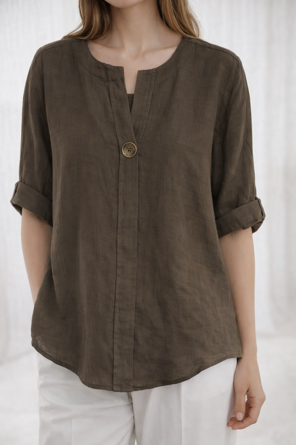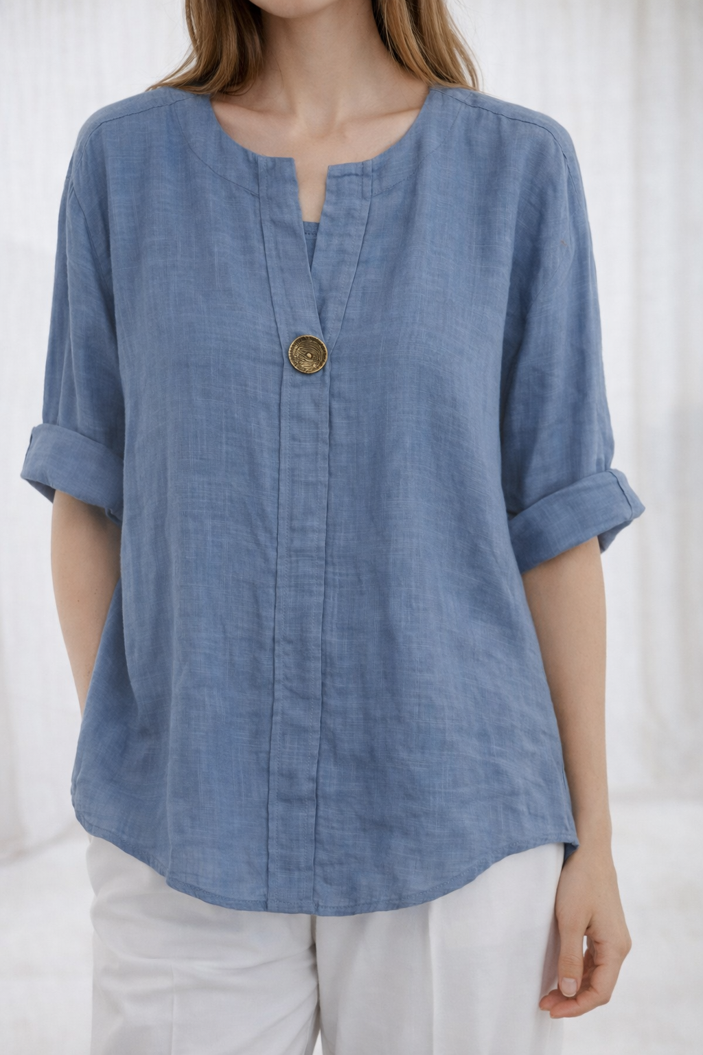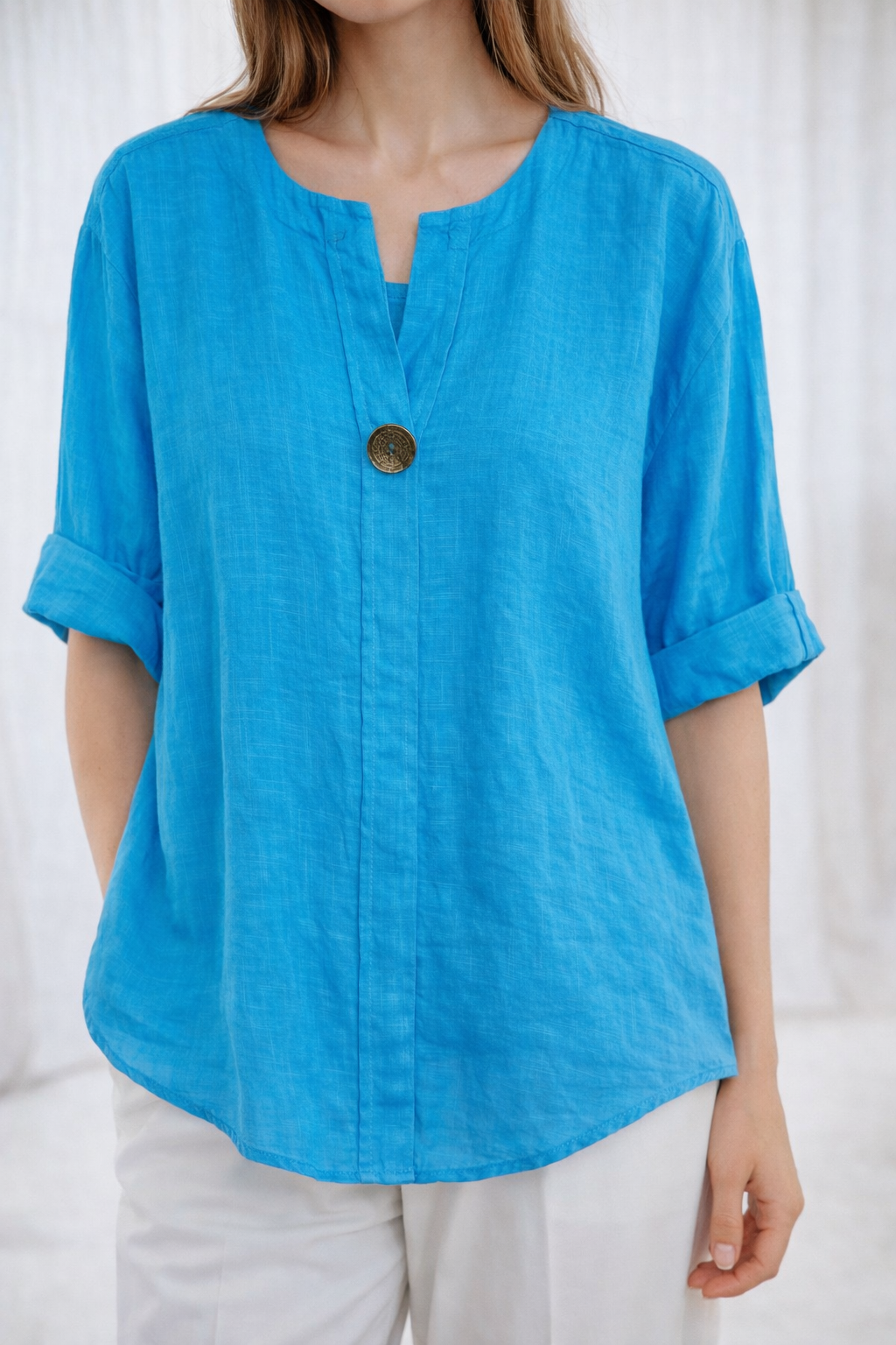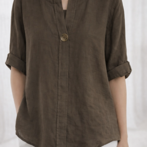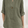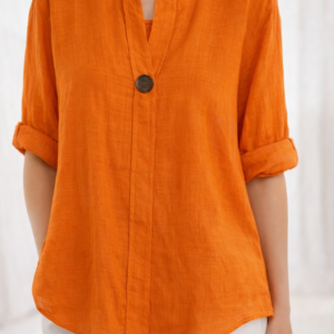 Blusa de lino para mujer con diseño casual y elegante. Cuenta con cuello redondo abierto, manga corta doblada y un botón decorativo frontal que le da un toque moderno. Su tela ligera y transpirable la hace perfecta para los días cálidos, ofreciendo comodidad y estilo al mismo tiempo. Ideal para combinar con jeans, pantalones o faldas, disponible en varios colores para adaptarse a diferentes estilos.