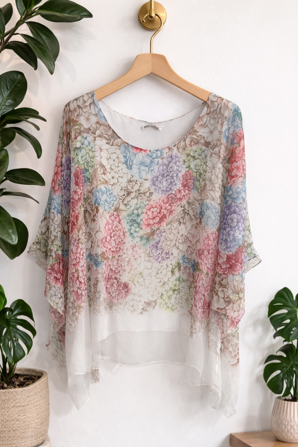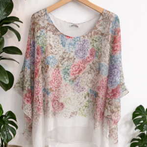 Elegante blusa de gasa ligera con delicado estampado floral y diseño suelto que aporta comodidad y estilo. Su cuello redondo y mangas amplias tipo murciélago crean una silueta fluida y favorecedora, ideal para un look fresco y femenino. Perfecta para combinar con jeans, pantalones o faldas en ocasiones casuales o salidas especiales. Disponible en varios colores para adaptarse a diferentes estilos.