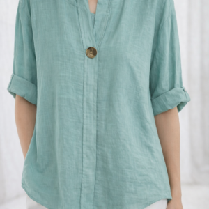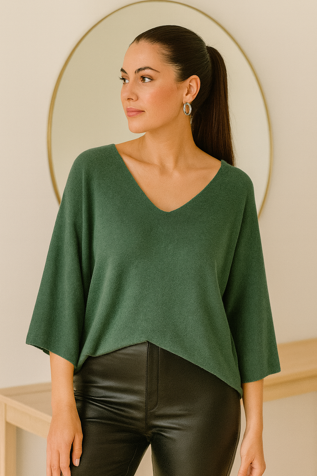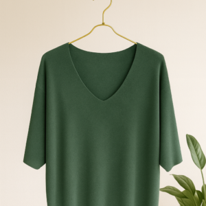 Blusa tejida verde de silueta amplia con escote en “V” pronunciado, diseñada para ofrecer comodidad y estilo en cualquier ocasión. Su tejido suave y ligero proporciona una caída fluida que favorece a todo tipo de cuerpo, mientras que las mangas de corte tres cuartos añaden un toque moderno y relajado. Perfecta para combinar con jeans, pantalones de vestir o cuero para un look elegante y versátil durante todo el año.