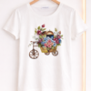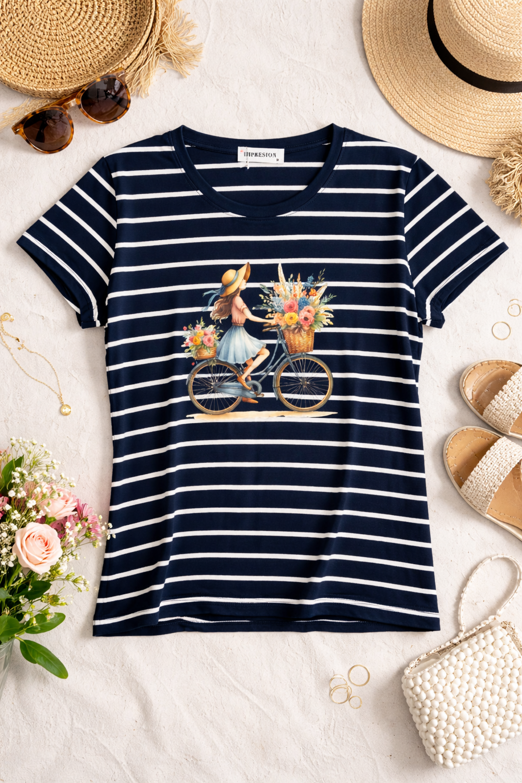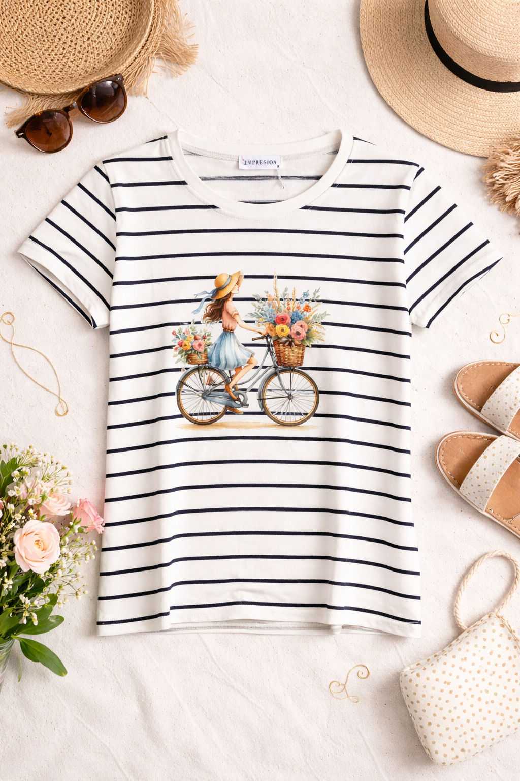Camiseta femenina de estilo fresco y veraniego con un encantador diseño de una chica paseando en bicicleta con una canasta llena de flores coloridas. El estampado combina un estilo ilustrado vintage con un toque romántico y alegre, perfecto para amantes de la naturaleza y los looks casuales. Su diseño a rayas le da un aire clásico y elegante, ideal para usar en primavera y verano. Combina perfectamente con jeans, faldas o shorts para un outfit cómodo y con estilo. Disponible en diferentes colores para adaptarse a tu personalidad. 🌸🚲☀️