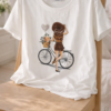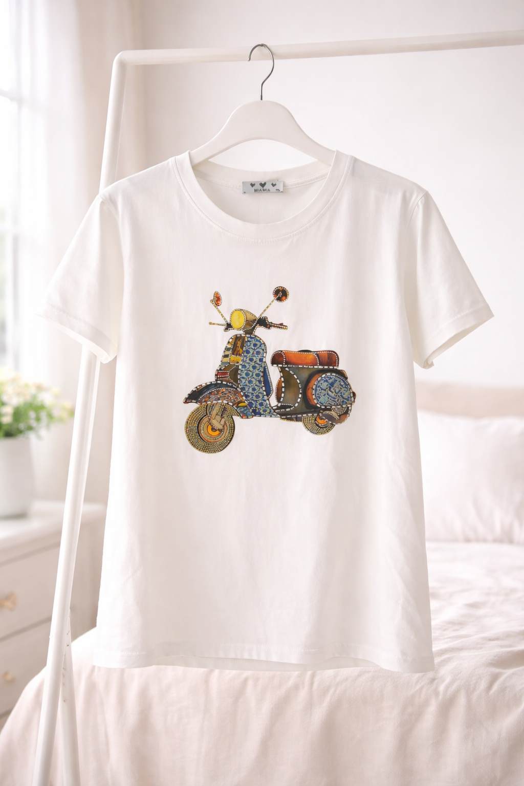 Camiseta blanca de estilo casual confeccionada en tejido suave y cómodo. Destaca por su ilustración central de un scooter vintage con un diseño artístico lleno de colores y detalles que le dan un toque original y moderno. Su corte clásico de manga corta y cuello redondo la convierte en una prenda versátil, perfecta para combinar con jeans o looks informales del día a día. Ideal para quienes buscan una camiseta básica con un diseño único y con personalidad.