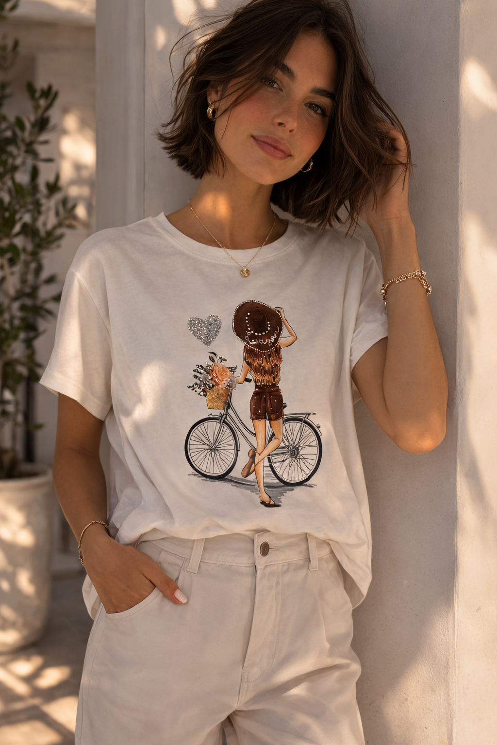 Camiseta blanca de mujer con un delicado diseño ilustrado de una chica junto a una bicicleta y un corazón brillante que aporta un toque femenino y elegante. Su estilo casual y moderno la convierte en una prenda ideal para el día a día, perfecta para combinar con jeans, shorts o pantalones claros para un look fresco y cómodo.