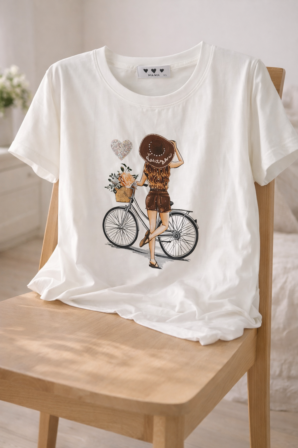 Sé el primero en comentar “Camiseta blanca mujer con ilustración chica y bicicleta y corazón brillante – estilo casual romántico”