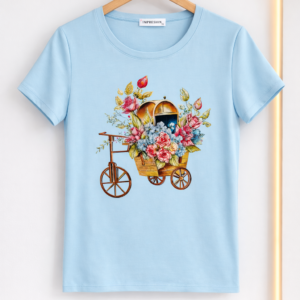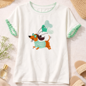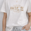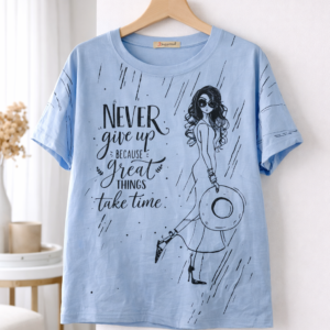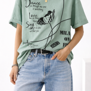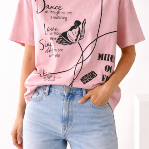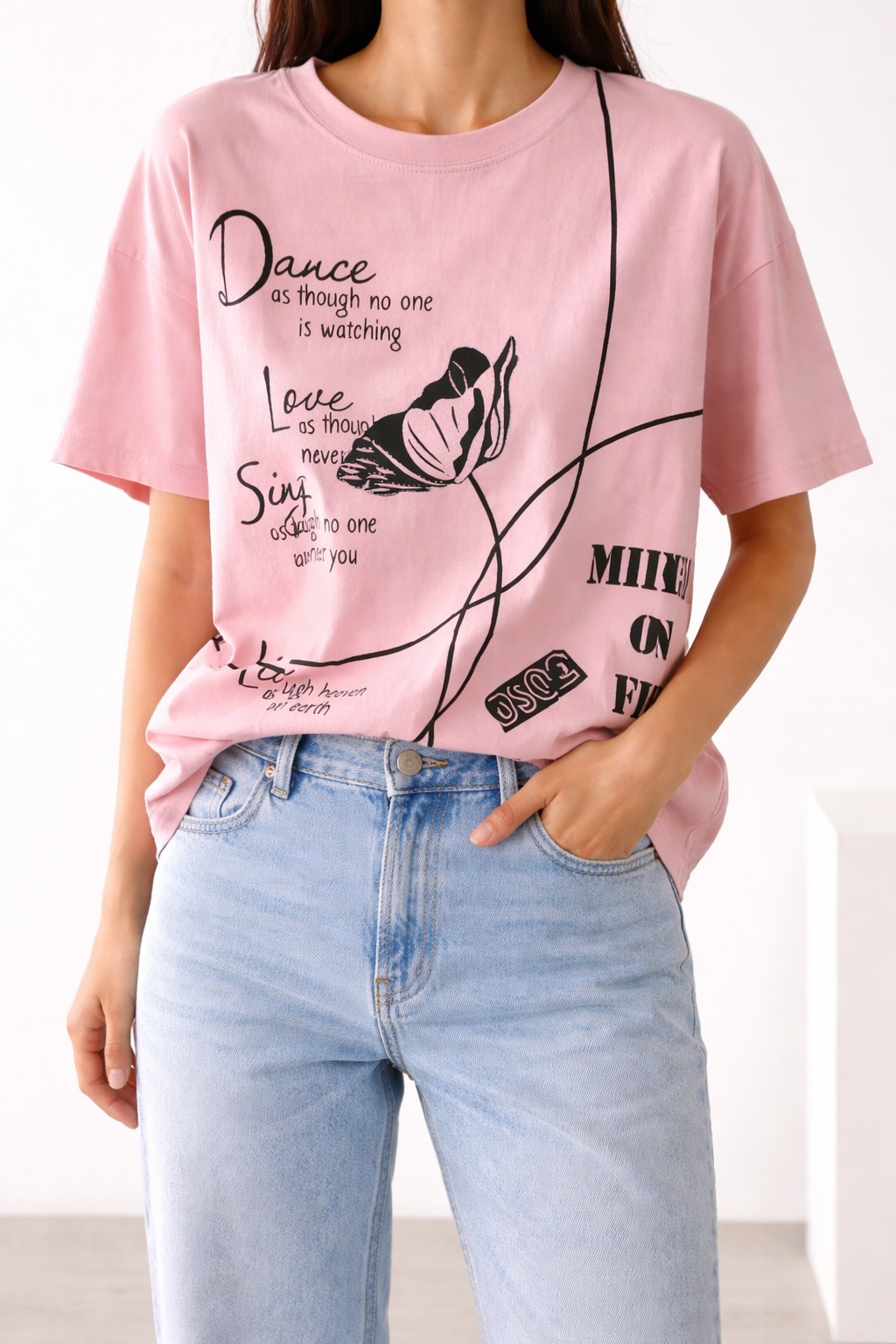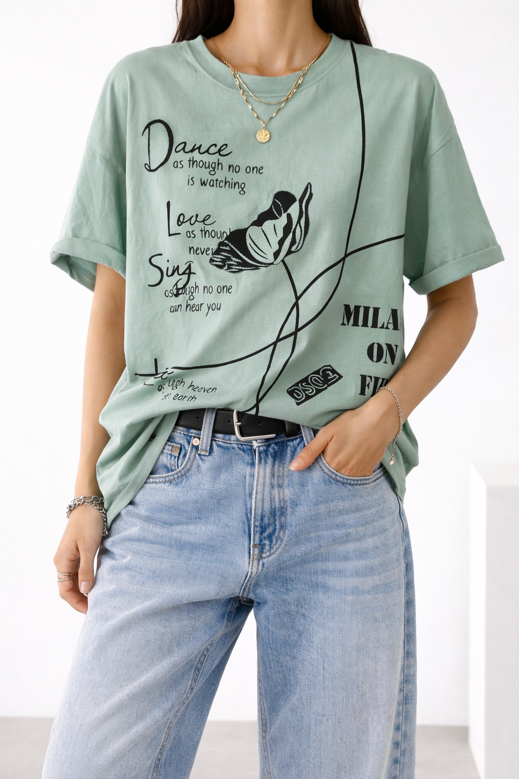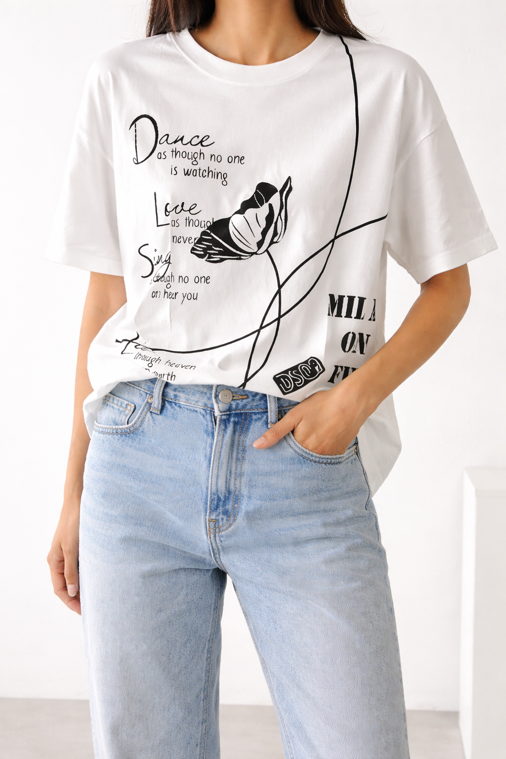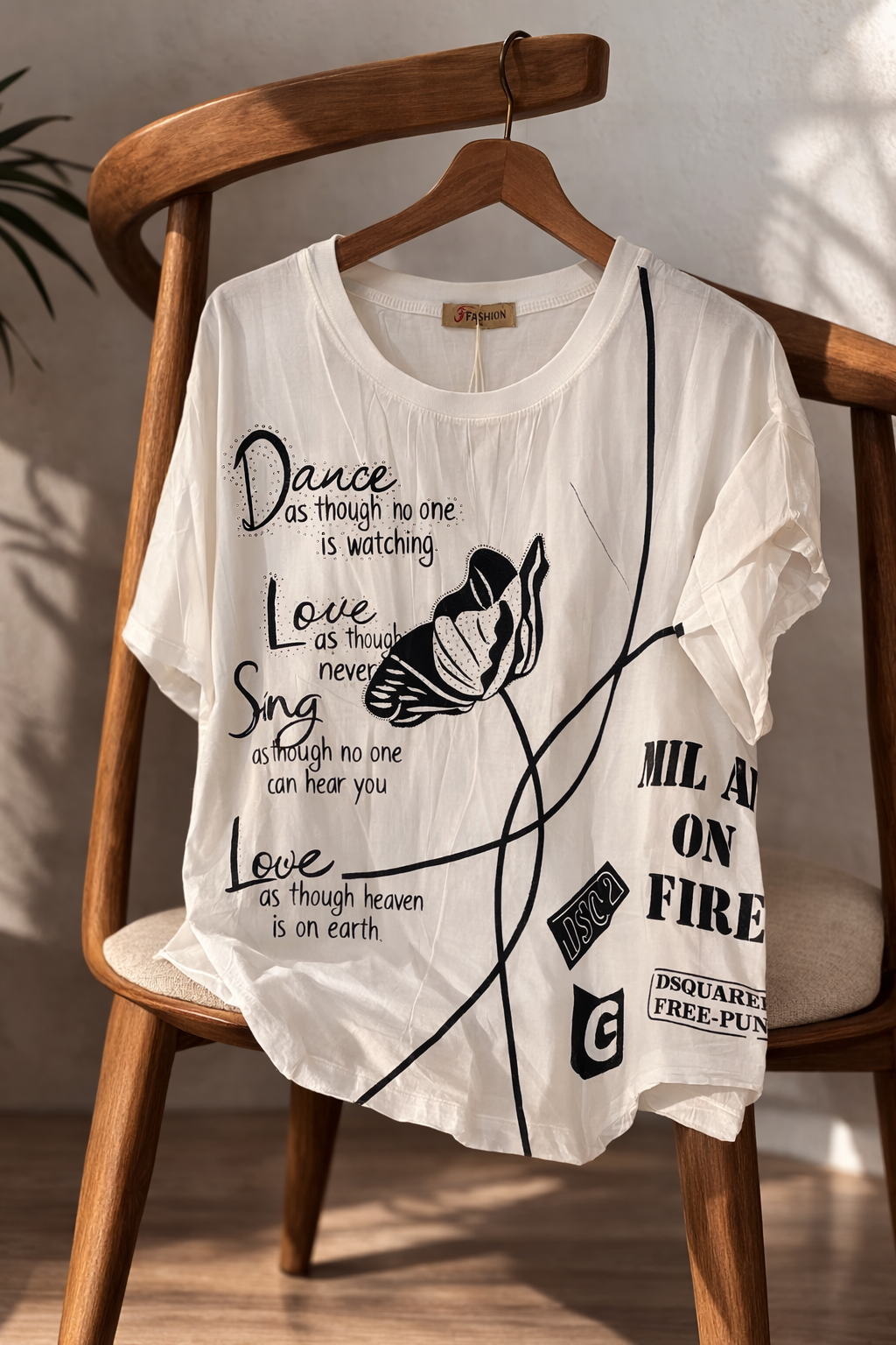 Camiseta femenina de estilo casual con diseño artístico y frases inspiradoras como “Dance as though no one is watching”. Su estampado moderno con ilustración y tipografía negra crea un look original y versátil.