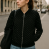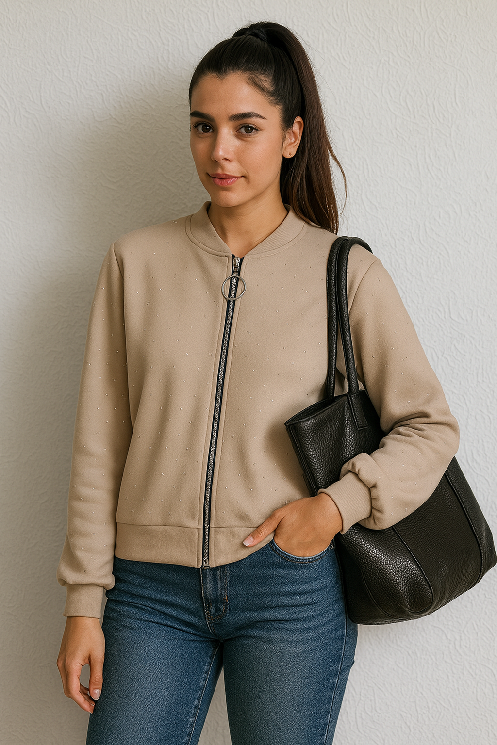 Chaqueta ligera y versátil de estilo casual en tono beige, diseñada con un cierre frontal metálico y un detalle de aro decorativo que añade un toque moderno. Su tejido suave presenta pequeños puntos texturizados, aportando un acabado elegante y sutil. Con puños cómodos y un ajuste relajado, es perfecta para un look diario cómodo, limpio y estilizado.