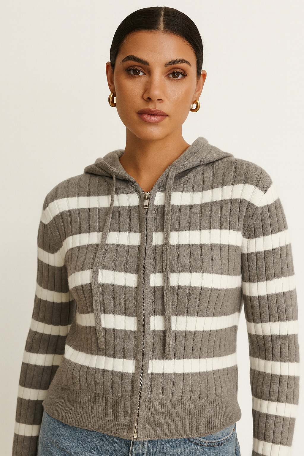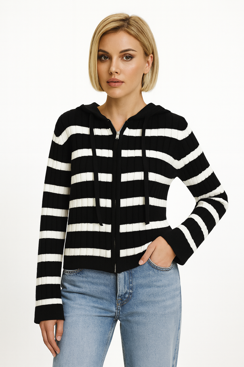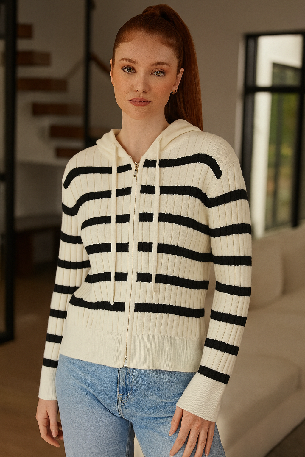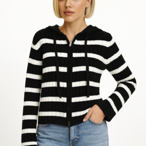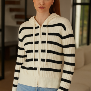 Chompa tejida de textura gruesa y suave, diseñada con un moderno patrón de rayas que aporta estilo sin perder comodidad. Incluye capucha ajustable y cierre frontal que permite usarla abierta o cerrada según tu look. Perfecta para el día a día, brindando abrigo, elasticidad y un calce cómodo que se adapta a tu figura. Ideal para combinar con jeans o prendas casuales.