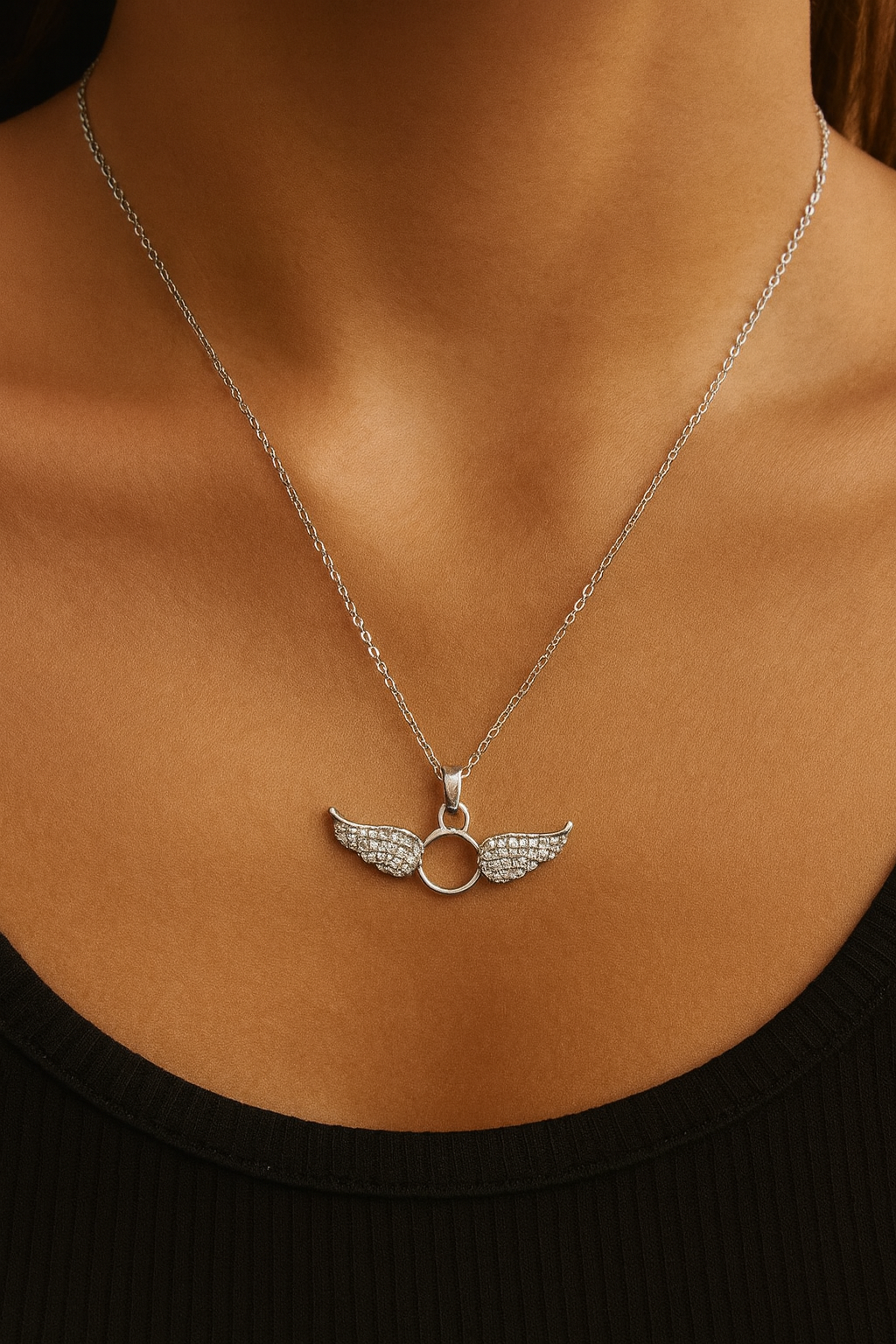 Este delicado collar está elaborado en acero inoxidable, un material resistente, hipoalergénico y libre de óxido para garantizar un brillo duradero. Su dije en forma de alitas de ángel con un aro central simboliza protección, libertad y buena energía. Cada ala está adornada con circonias cúbicas que añaden un brillo elegante y sofisticado.