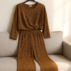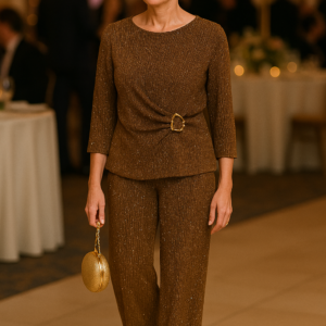 Conjunto de dos piezas confeccionado en tela suave con destellos brillantes ✨ que aportan un toque sofisticado. La blusa cuenta con mangas largas y una hebilla decorativa dorada que estiliza la figura, mientras que el pantalón recto de tiro alto ofrece comodidad y movilidad. Ideal para eventos especiales, cenas festivas o celebraciones donde quieras lucir elegante sin perder comodidad. Disponible en tonos dorado y negro.