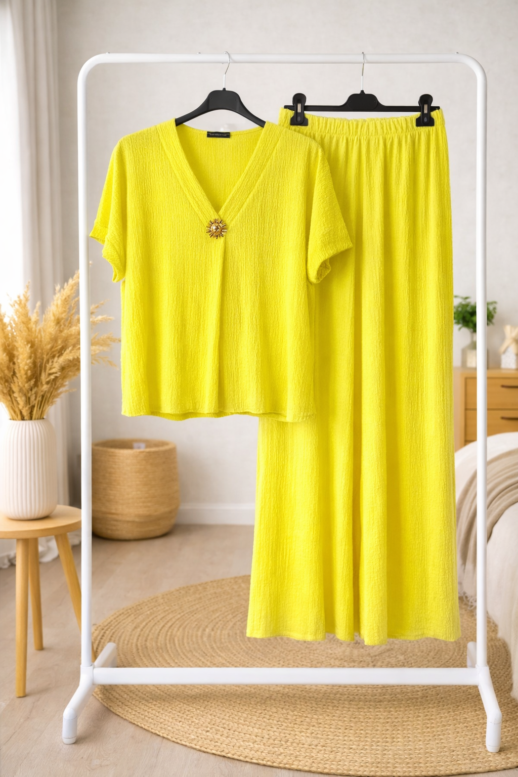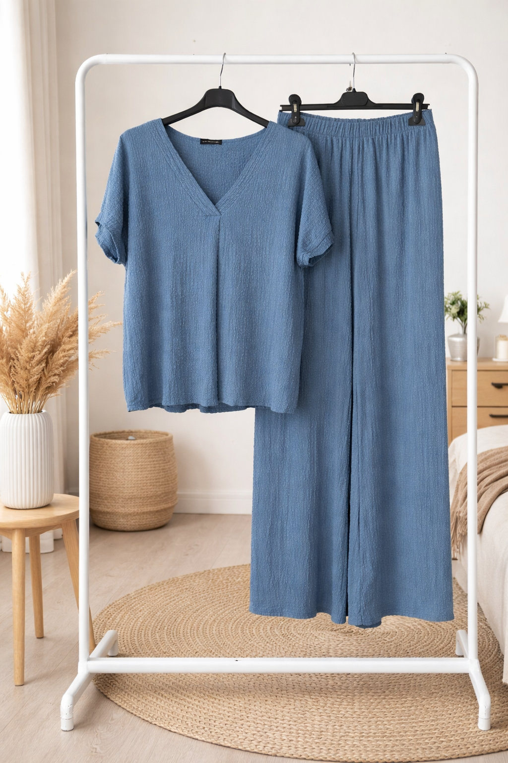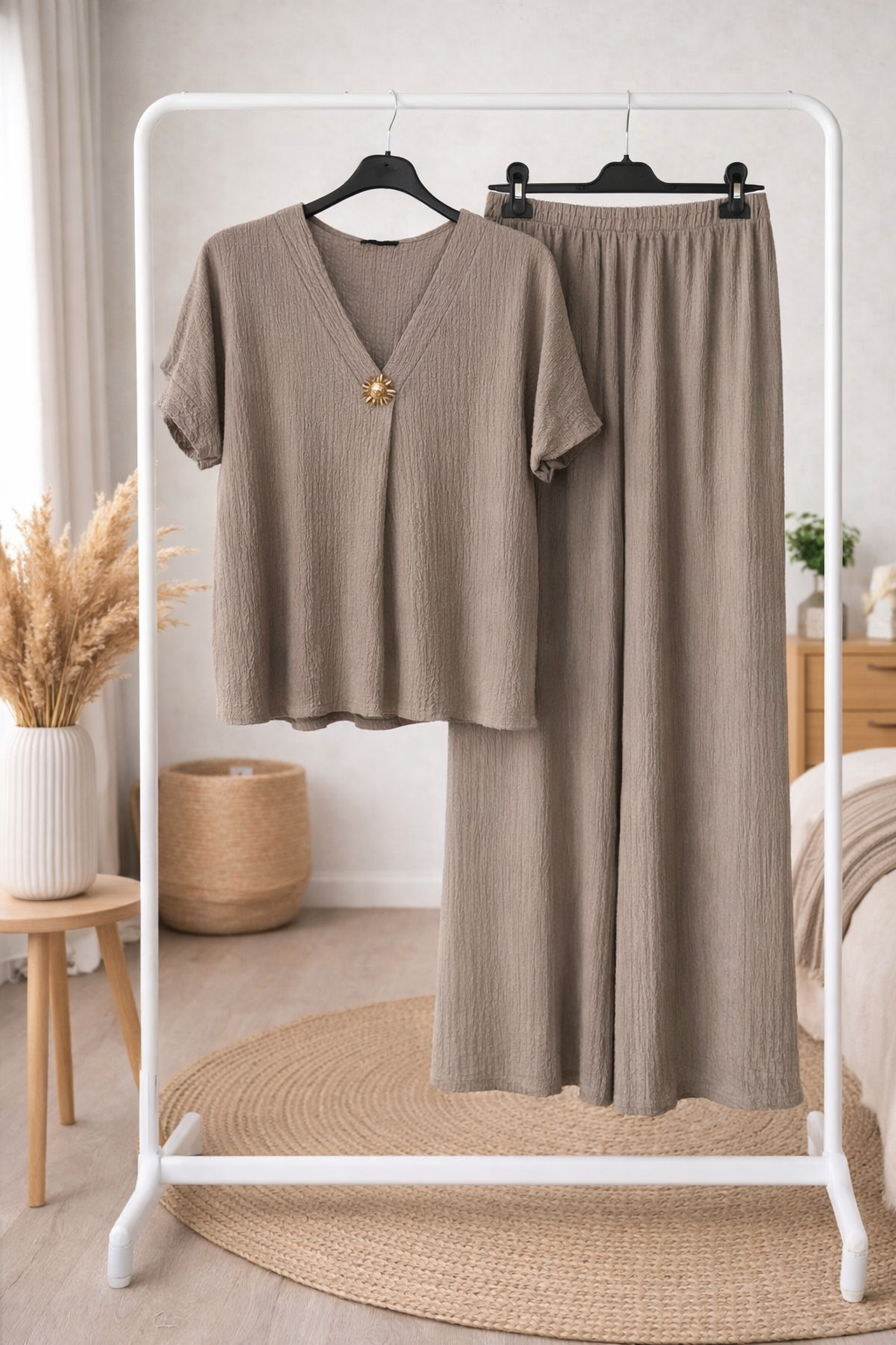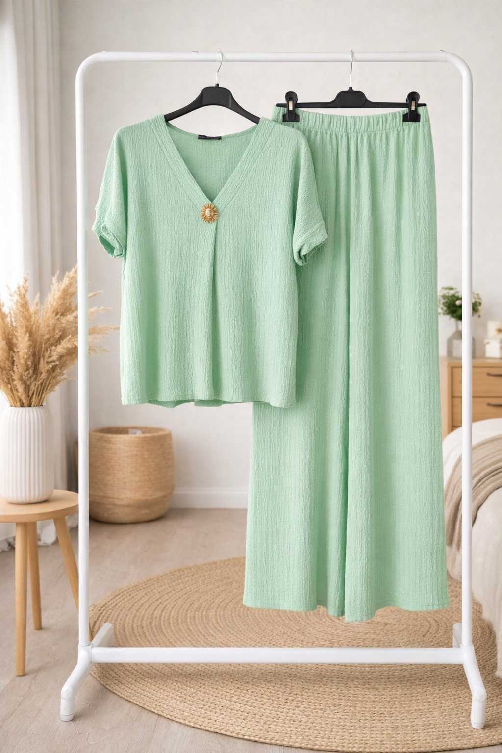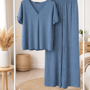 Conjunto femenino de dos piezas compuesto por una blusa de manga corta con escote en V y detalle decorativo al frente, combinado con un pantalón palazzo de pierna ancha y cintura elástica que ofrece máxima comodidad y libertad de movimiento. Su tela ligera y texturizada brinda un estilo moderno, fresco y elegante, ideal para uso diario, salidas casuales, viajes o reuniones informales. Disponible en varios colores para adaptarse a diferentes gustos y estilo