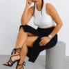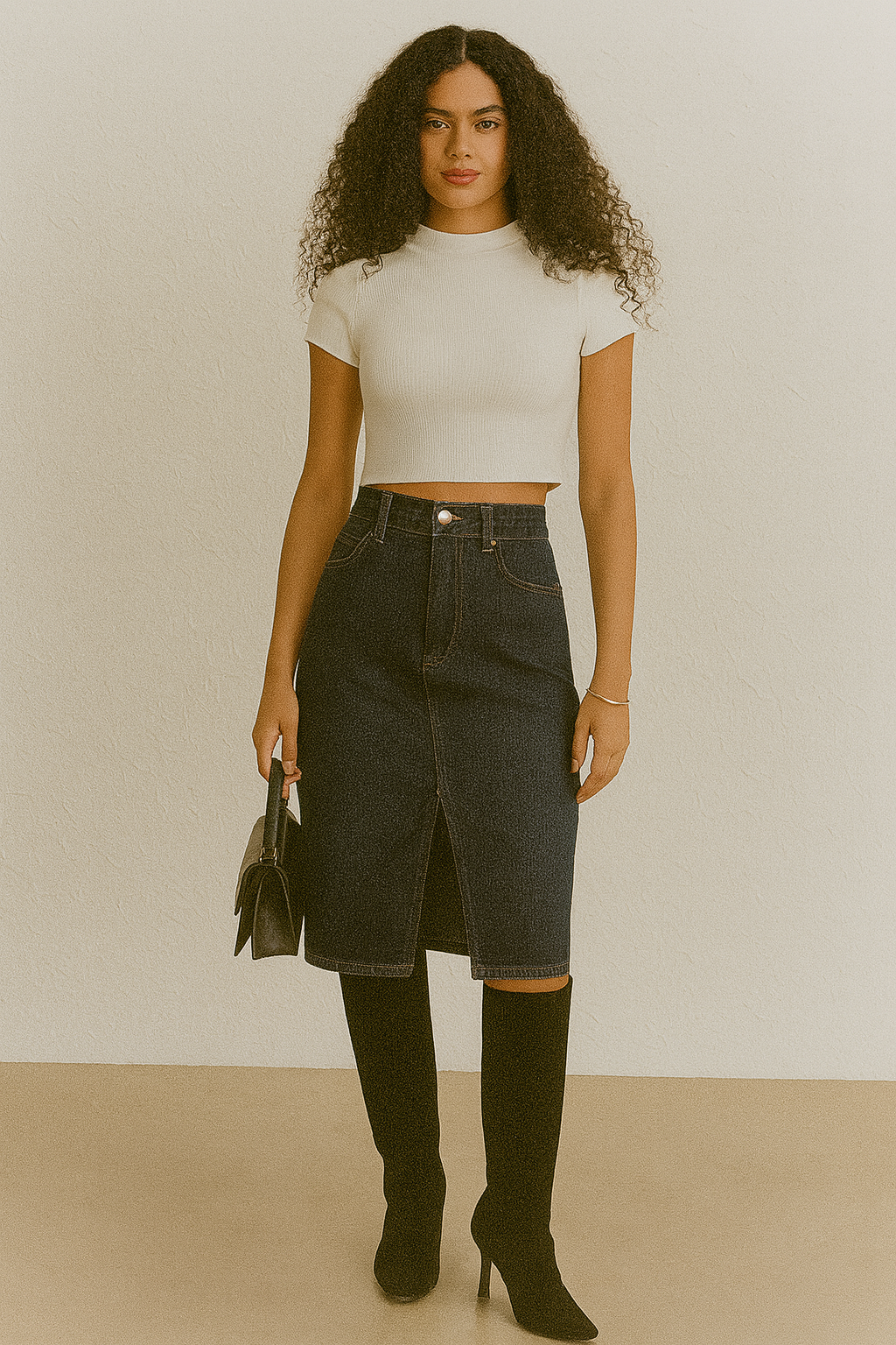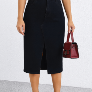 Esta falda midi de mezclilla en color negro ofrece un estilo moderno y favorecedor gracias a su corte recto y su distintiva abertura frontal. Con pretina clásica, bolsillos tipo denim y un tejido resistente con ligera elasticidad, es una prenda versátil ideal para combinar con tops, blusas o suéteres. Perfecta para looks casuales, urbanos o más sofisticados, siendo un básico imprescindible con un toque actual.