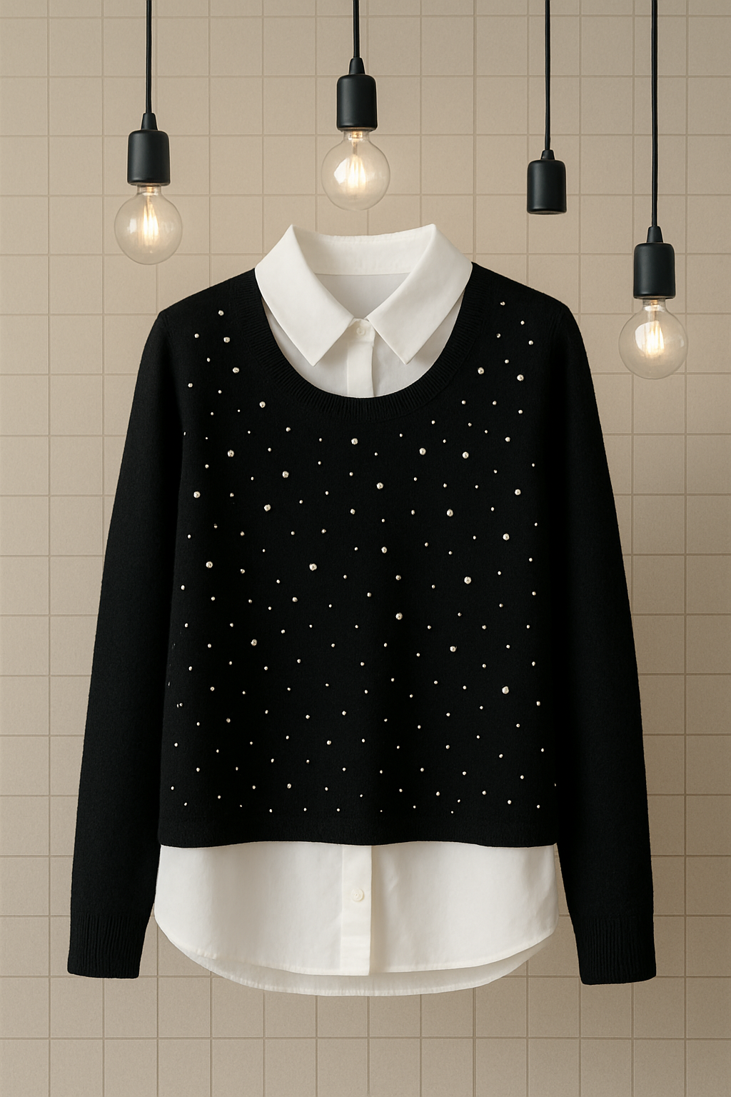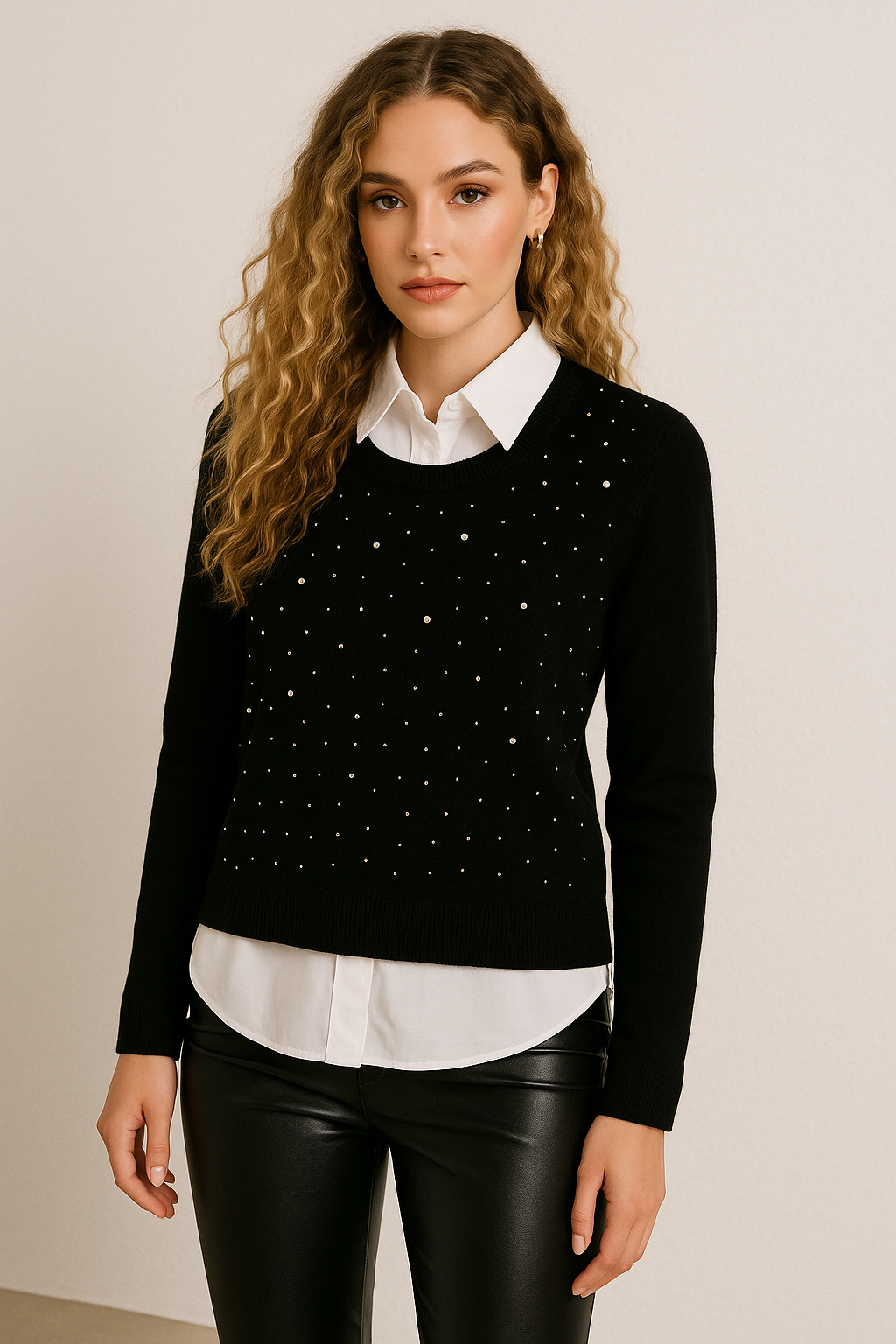 Este jersey dos en uno combina la elegancia de una blusa clásica con la comodidad de un suéter suave, creando un look impecable sin esfuerzo. Presenta un cuello camisero blanco integrado, que aporta un acabado pulido y sofisticado, mientras que el cuerpo del jersey, en color negro, está adornado con aplicaciones de pequeñas perlas que añaden un toque femenino y luminoso.