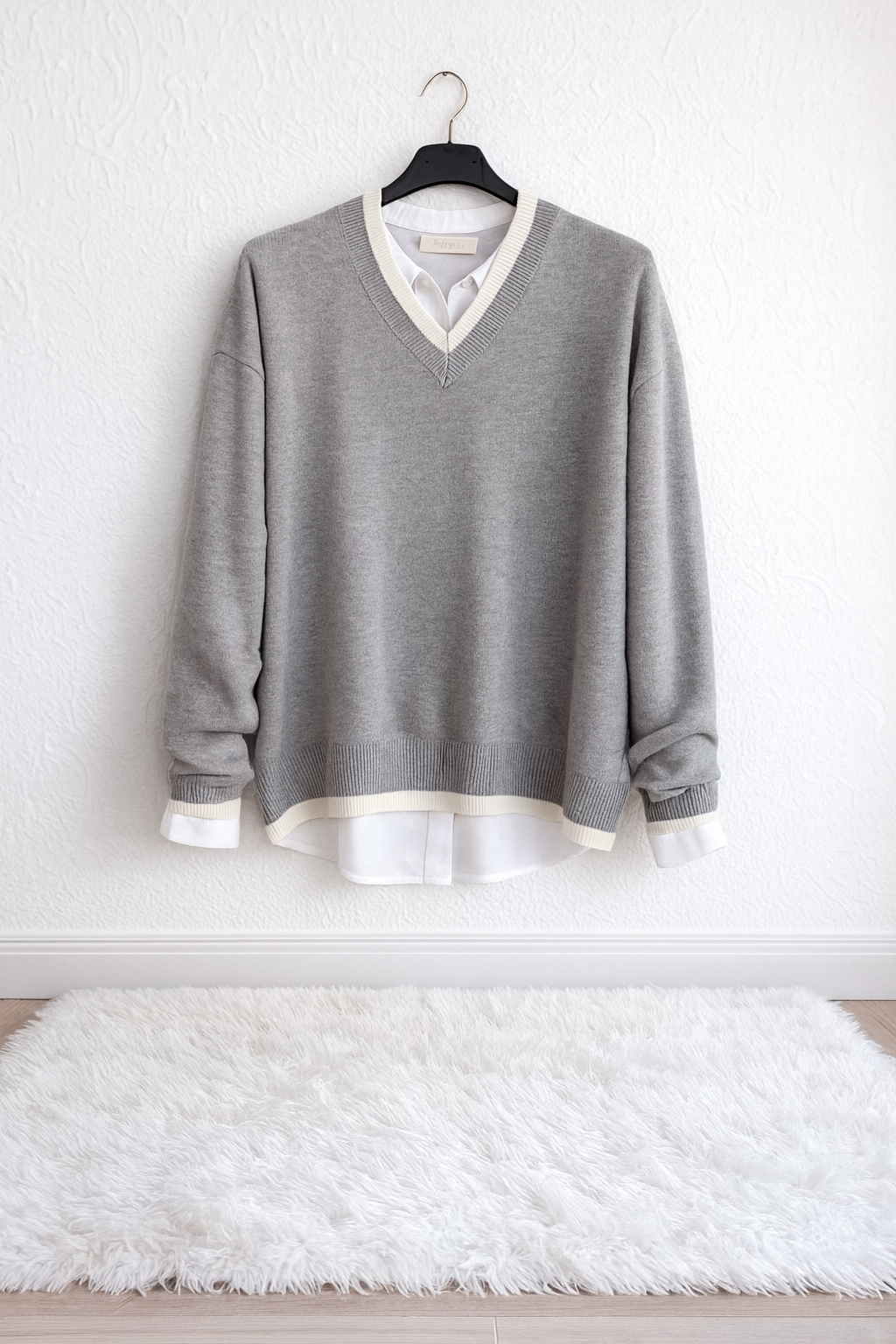 Este jersey gris de punto presenta un diseño sencillo y elegante con cuello en V y acabados delicados en el borde. Su tejido suave y confortable lo convierte en una prenda versátil, ideal para el día a día. Perfecto para combinar con faldas, pantalones o vaqueros, aportando un estilo clásico y atemporal a cualquier outfit.