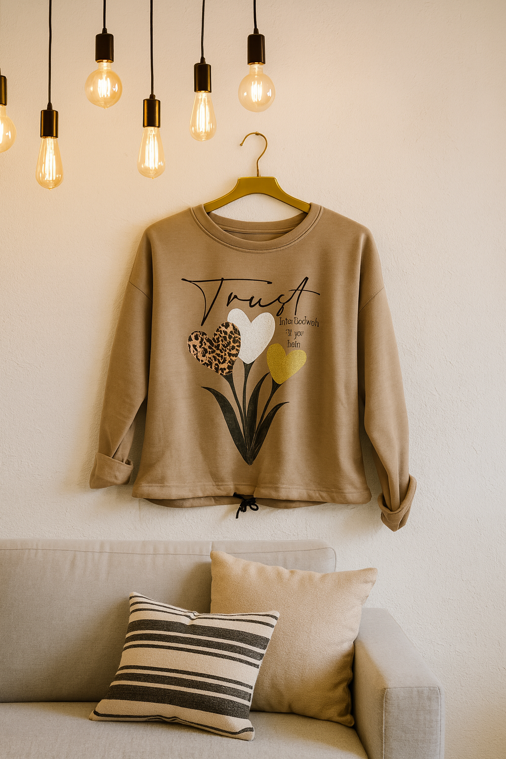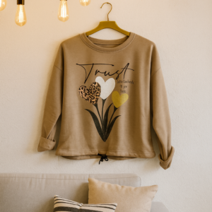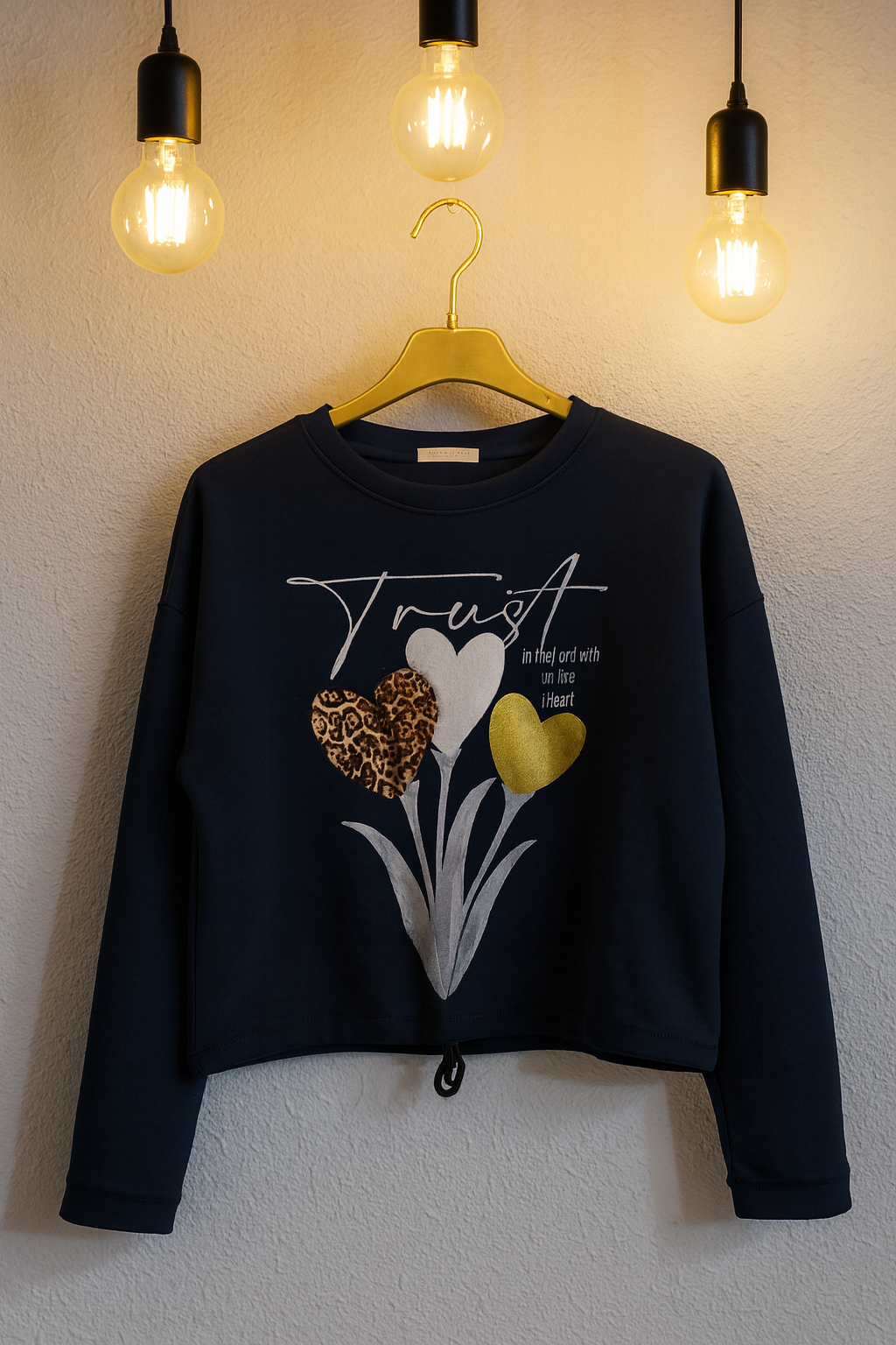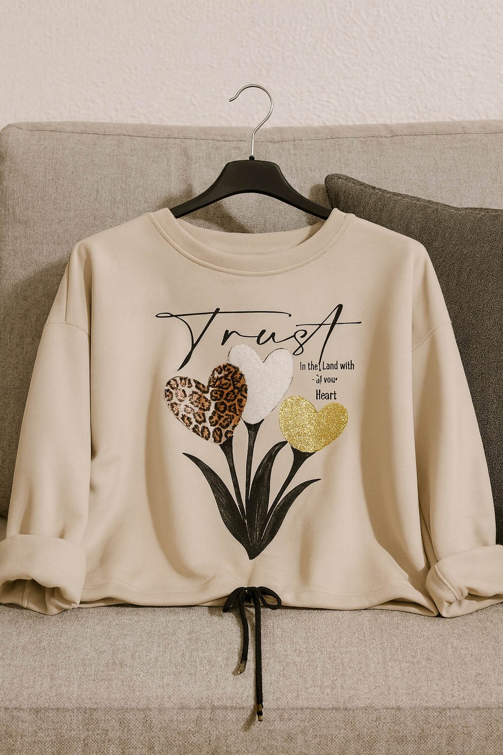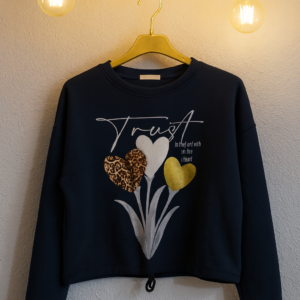 camiseta suave y cómodo con diseño frontal de tres corazones decorativos: uno con estampado animal print, otro tipo peluche y otro con brillo dorado Incluye cordón ajustable en la basta y mangas con estilo relajado. Ideal para un look casual con un toque tierno y moderno. ¡Perfecto para combinar con jeans o leggins!