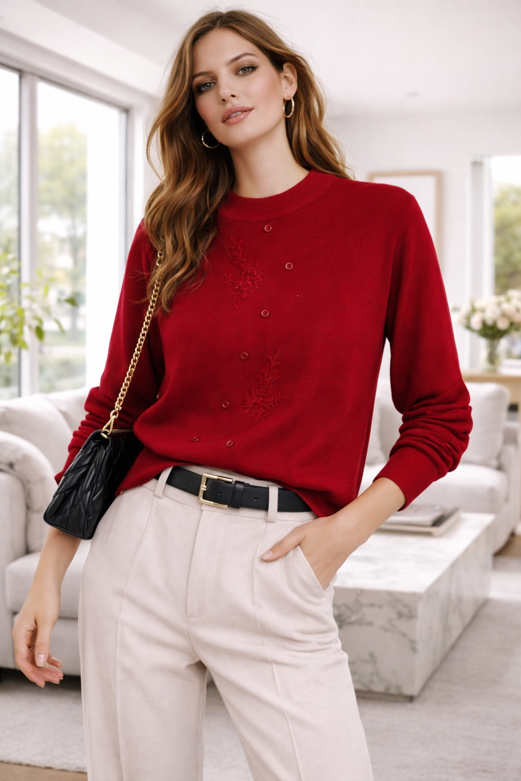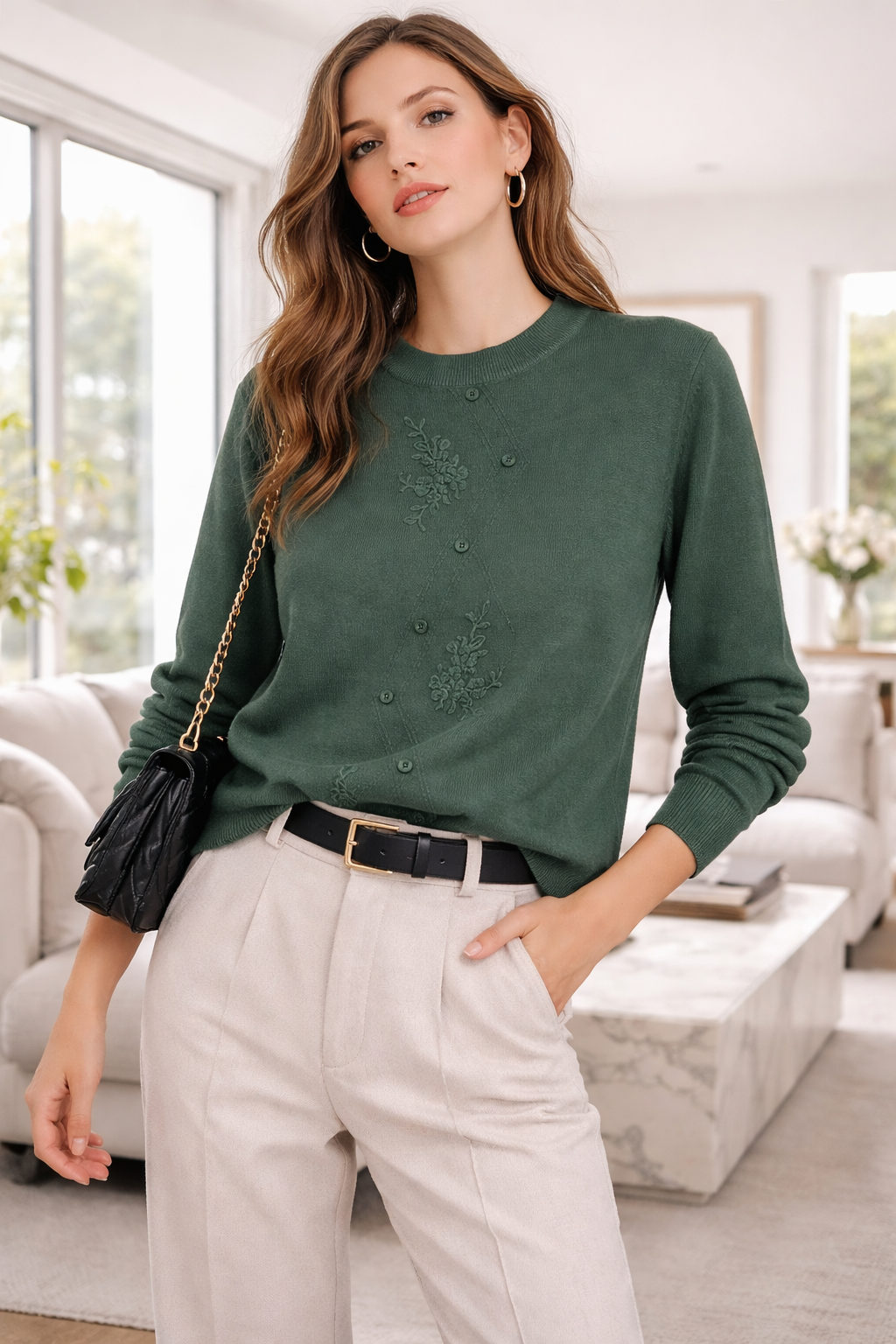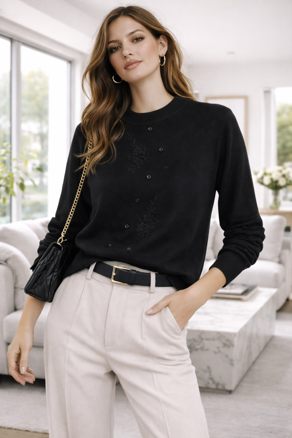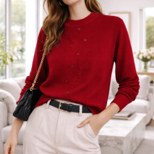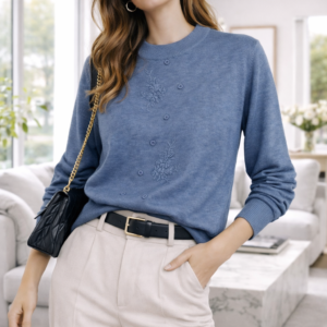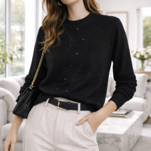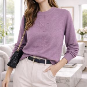 Este suéter de punto fino combina elegancia y comodidad en una prenda versátil ideal para cualquier ocasión. Su diseño presenta delicados bordados florales en relieve y una hilera de botones decorativos que aportan un toque femenino y sofisticado. El cuello redondo clásico y el ajuste favorecedor lo convierten en una opción perfecta tanto para looks casuales como para outfits más formales.