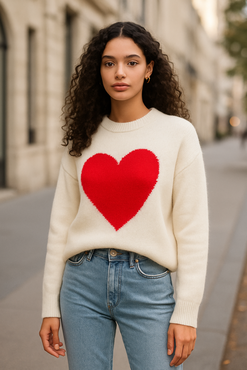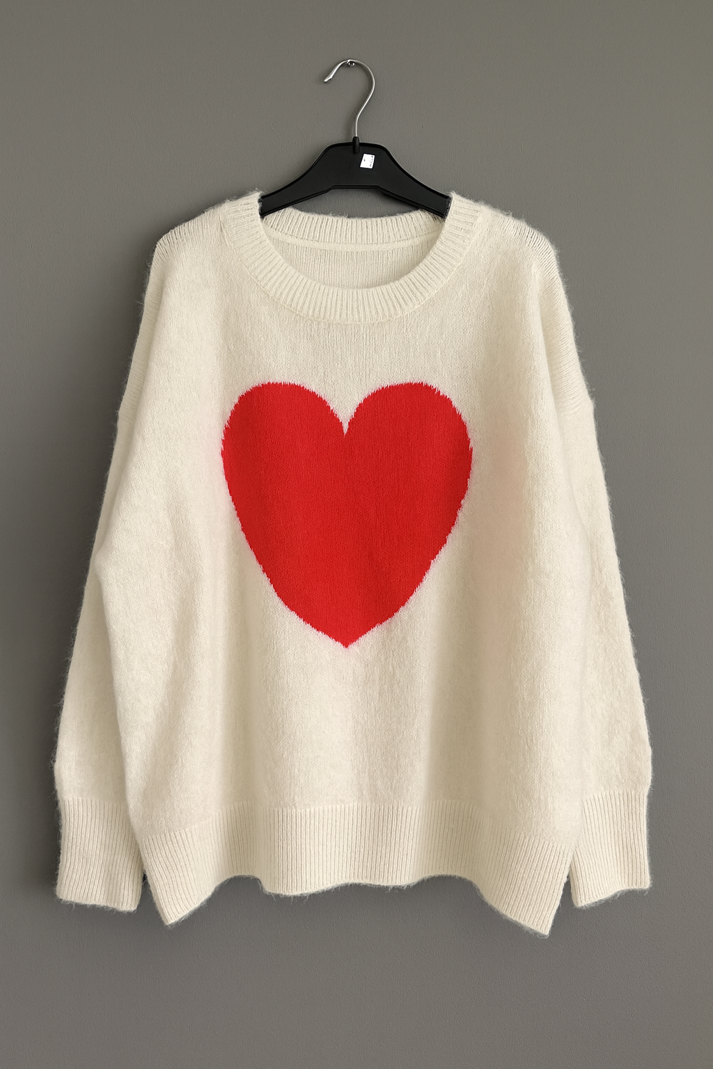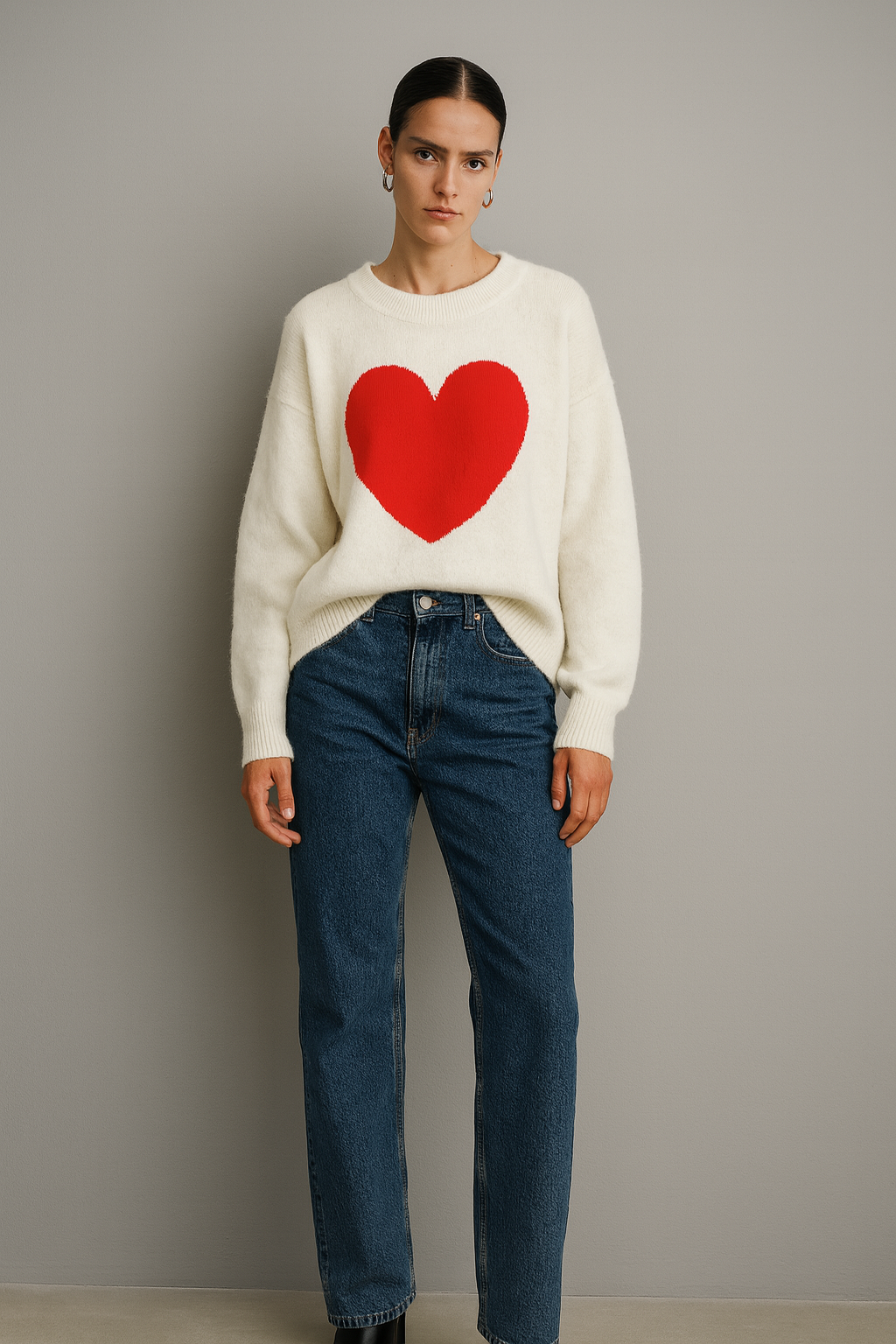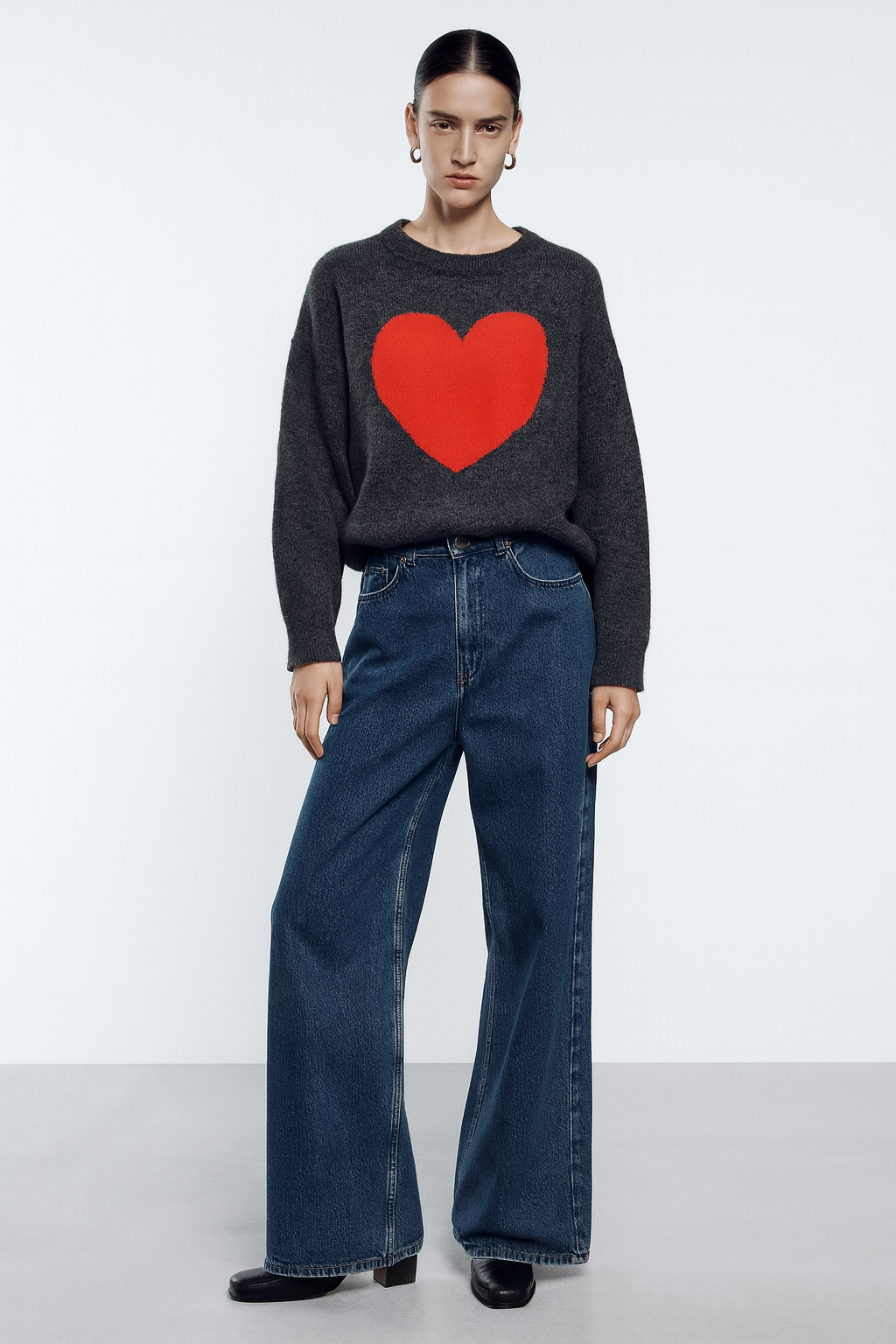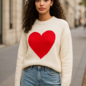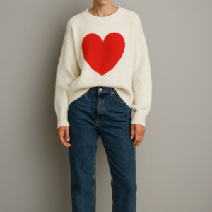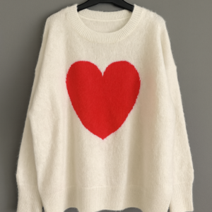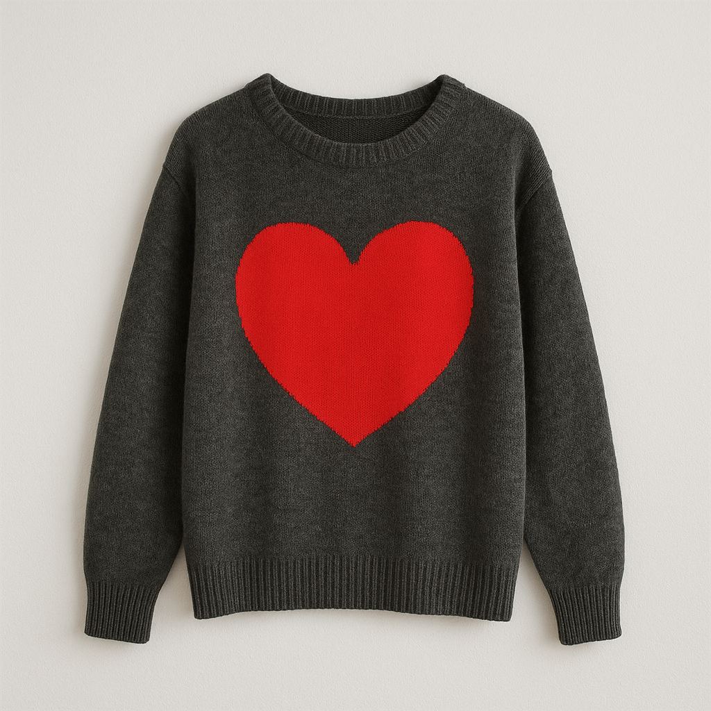 Suéter de punto suave en color gris oscuro con un gran corazón rojo tejido al frente, que aporta un toque moderno y adorable al look. Presenta un diseño de ajuste relajado con hombros ligeramente caídos y cuello redondo clásico. Su textura acolchada y su caída holgada lo convierten en una prenda cómoda y versátil, ideal para combinar con jeans o pantalones anchos para un estilo casual con personalidad.