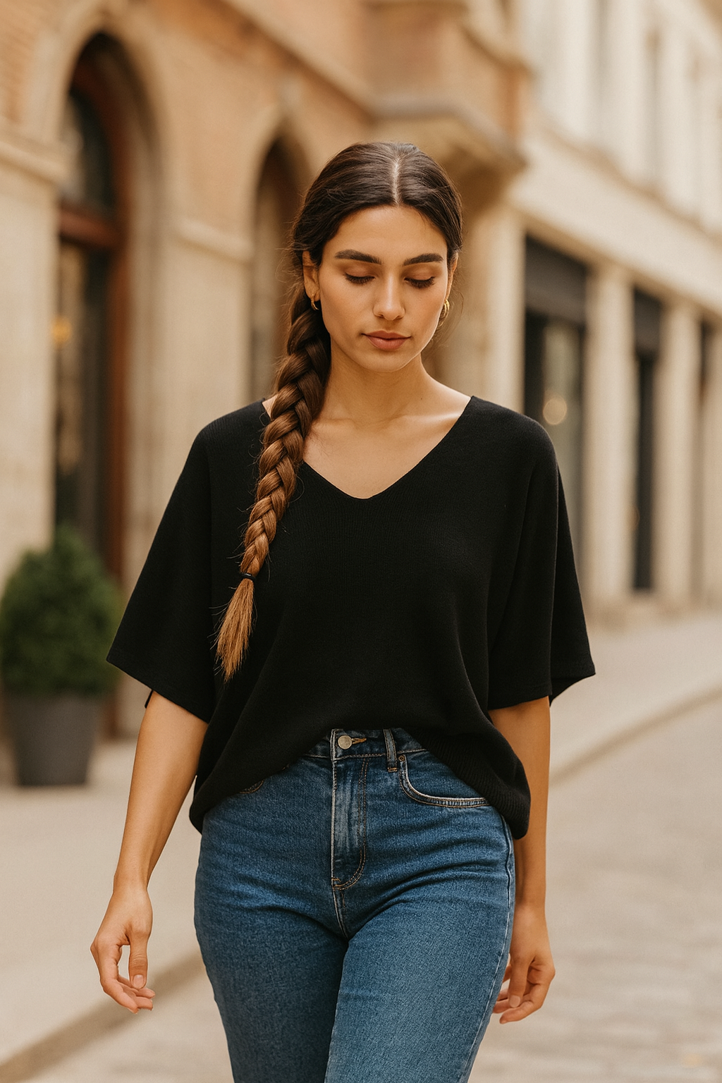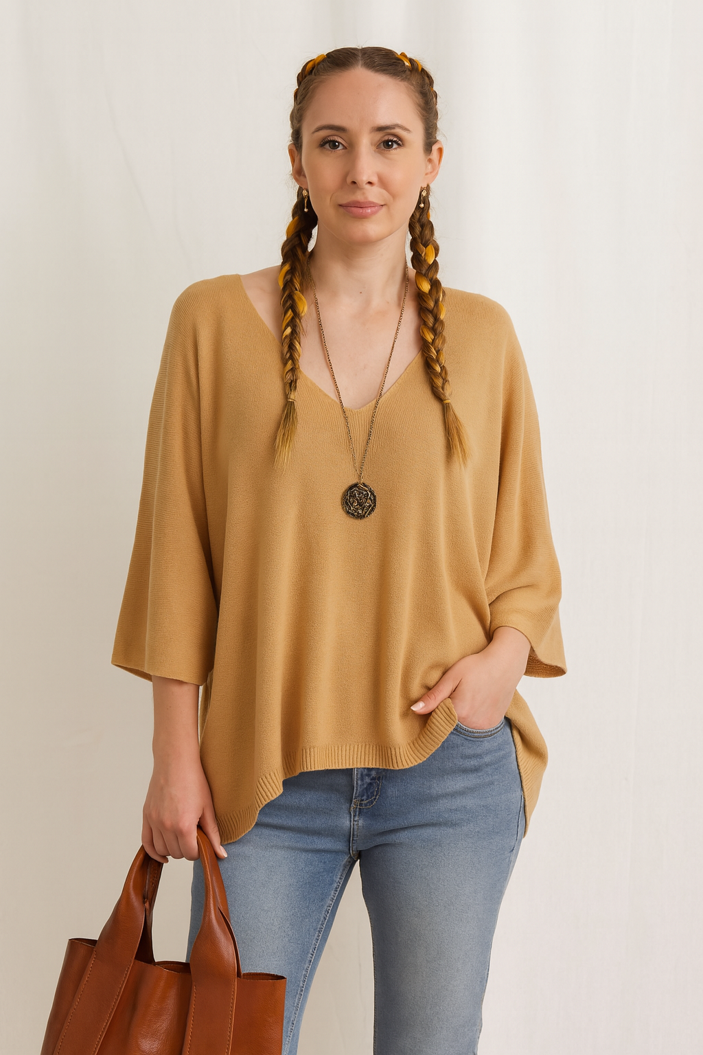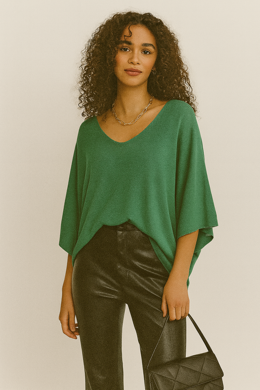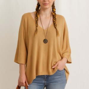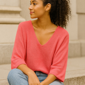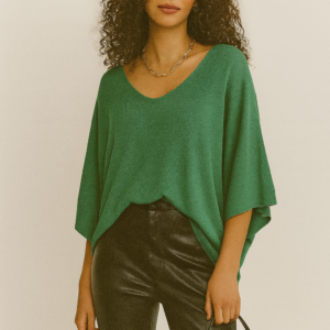 Este suéter oversize de punto suave es la combinación perfecta de comodidad y estilo. Su diseño con escote en V aporta un toque femenino y favorecedor, mientras que las mangas amplias tipo murciélago ofrecen una caída suelta y relajada, ideal para outfits casuales y versátiles.