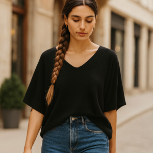 Blusa de punto en color negro, confeccionada con un tejido suave, ligero y de caída fluida. Presenta un elegante escote en “V” y mangas amplias tipo murciélago que aportan comodidad y un estilo relajado. Su diseño versátil permite combinarla fácilmente con jeans, faldas o pantalones formales, ideal tanto para looks casuales como más sofisticados. Una prenda básica e imprescindible en cualquier guardarropa.