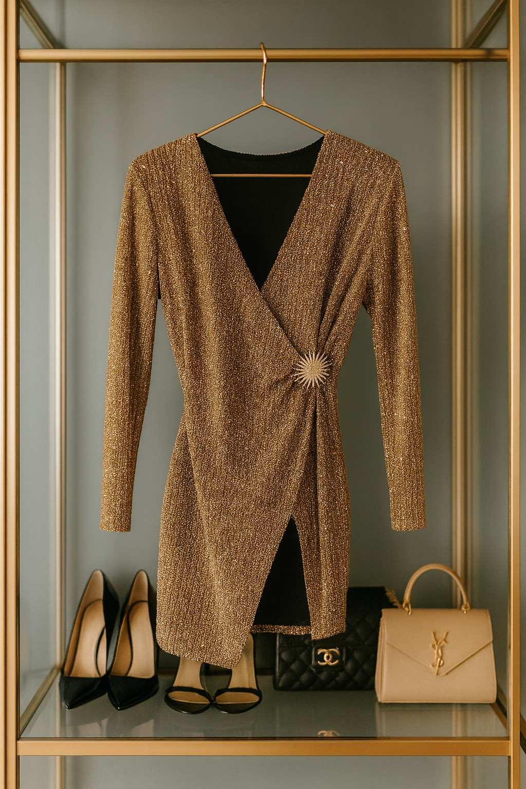 Deslumbra en cualquier ocasión especial con este elegante vestido dorado cruzado, confeccionado en un tejido brillante que realza la figura con sutileza y sofisticación. Su diseño de escote en V y manga larga aporta un toque refinado, mientras que el detalle lateral con broche dorado estilo estrella añade un acabado lujoso y distintivo. La falda con cruce frontal y abertura proporciona un movimiento fluido y femenino, perfecto para eventos nocturnos, cenas formales o celebraciones. Un vestido que combina glamour, comodidad y estilo en una sola prenda.