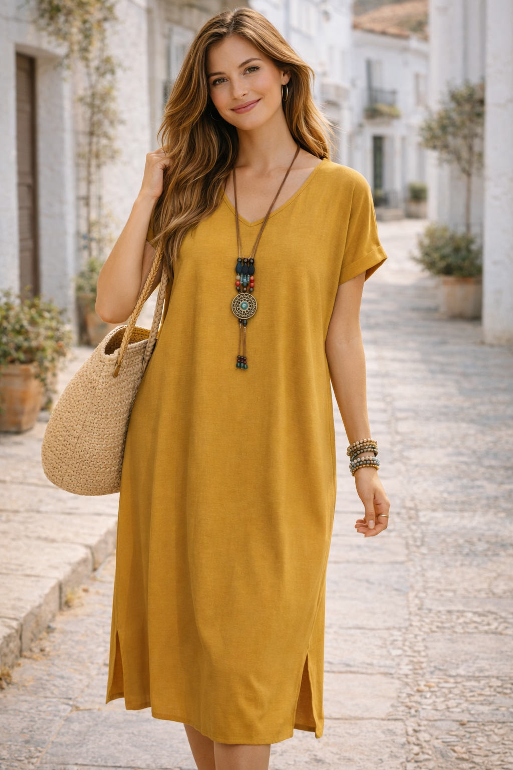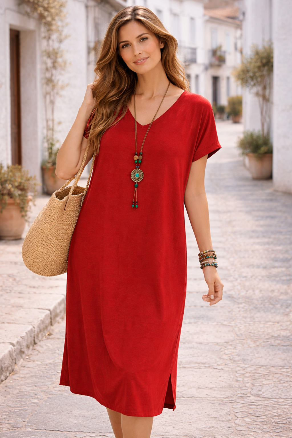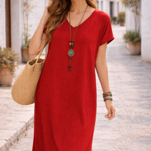 Vestido midi cómodo y elegante para mujer, diseñado con cuello en V, manga corta y corte suelto que brinda frescura y libertad de movimiento. Su tejido ligero lo hace perfecto para el uso diario, vacaciones, paseos o salidas casuales. Un estilo versátil que puedes combinar fácilmente con sandalias, zapatillas o accesorios para lograr un look moderno y relajado. Disponible en varios colores. ✨