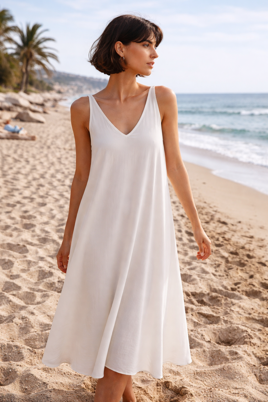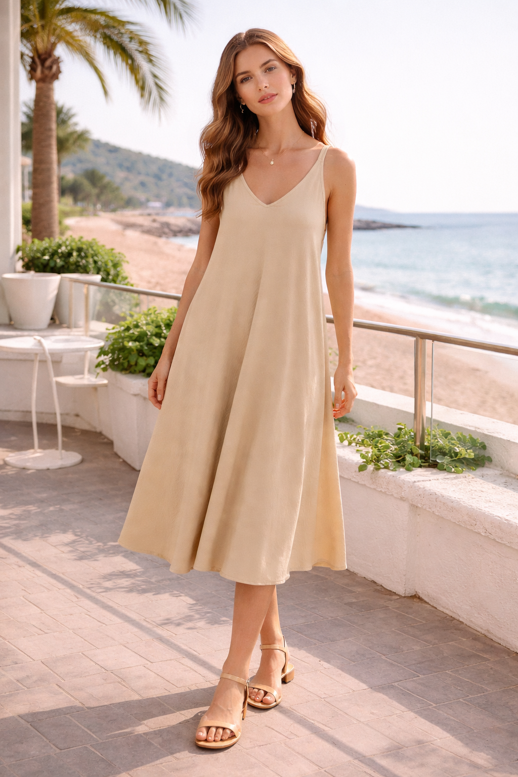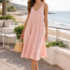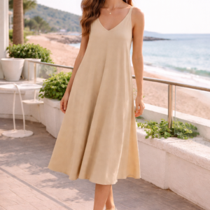 Este vestido midi de tirantes es la combinación perfecta de comodidad, frescura y estilo. Con un favorecedor escote en V y una silueta fluida tipo A, cae suavemente para crear un movimiento elegante y natural. Su tejido ligero lo hace ideal para días cálidos, paseos junto al mar o vacaciones de verano. Versátil y fácil de combinar con sandalias o accesorios minimalistas, es una prenda imprescindible para un look relajado pero sofisticado. Disponible en varios colores para adaptarse a tu estilo. ☀️🌊👗
